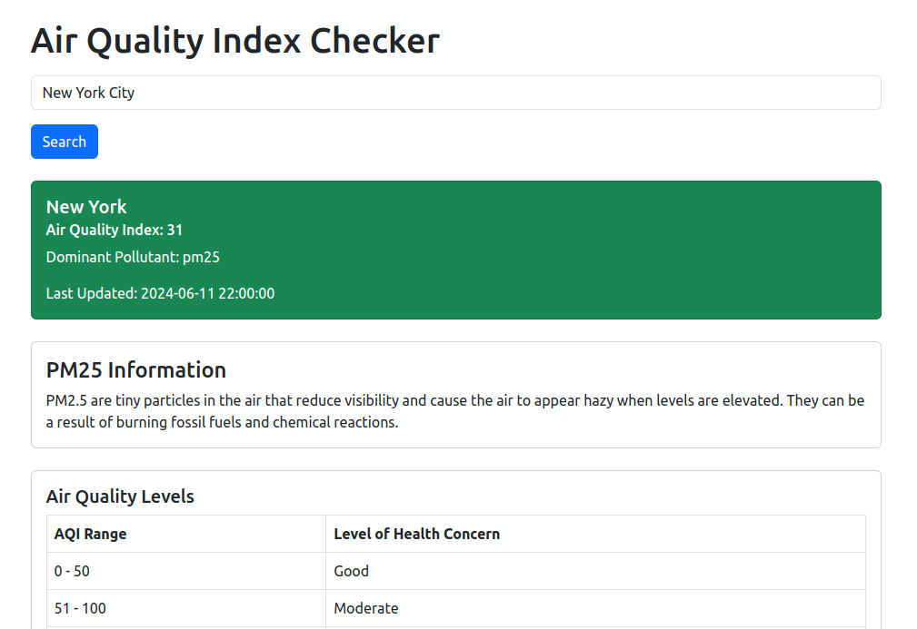 Air Quality Index is an application that allows for search of major cities air quality. The application is is built using React.js (HTML, CSS and JavaScript) for the front-end and makes use of an air quality index API.