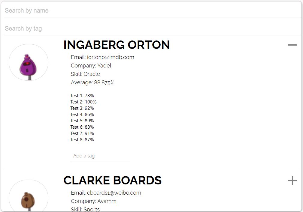 Student Info displays information about students that is provded by an API. It allows for search/filter by name, and also by tag. Tags are added by the user by utilizing the "Add Tag" feature.